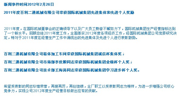 百利二通機(jī)械有限公司先進(jìn)集體和先進(jìn)個(gè)人表彰